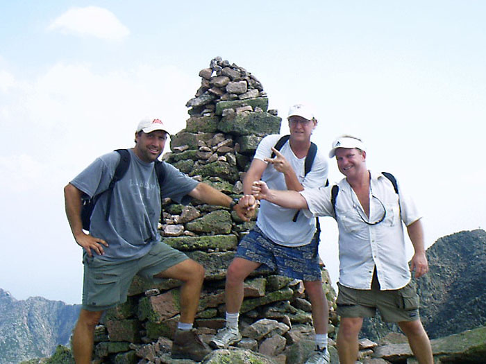 | Keith Peterson, Jon Wells and Mark Andrews at summit cairn, August 2002. | ||||||||||||||