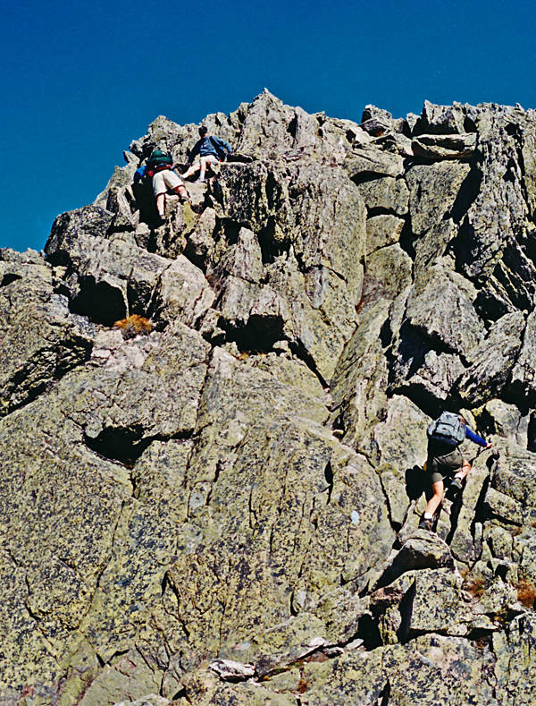 | Shelley at the lower right making her way up a steep section of the knife edge ridge. Unknown climbers at the top. | ||||||||||||||