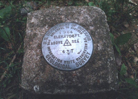 This is the benchmark found on the mountain on May 16, 2000. The original MAG benchmark seems to have been replaced by this one. A search of the USGS database for 43T does not bring up anything. The date is 1964 and the elevation is 2753 feet although the last three is a bit hard to make out in this photo. |