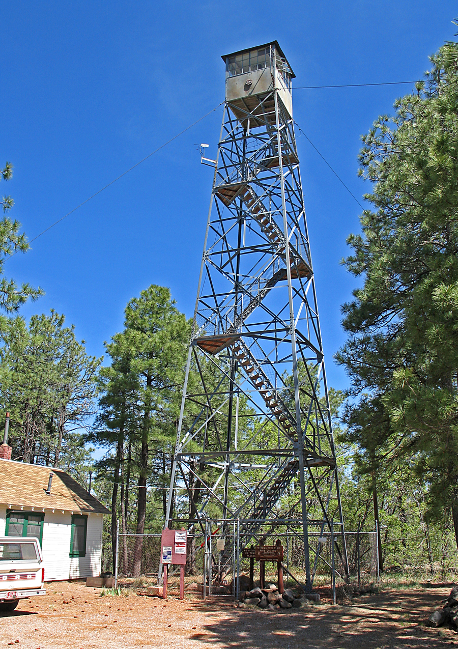 | Mingus Mountain lookout has a 60 ft. tower made by Pacific Coast Steel. It was built in 1935 and replaced a 41 ft. wood tower dating from the 1920's. This lookout is on the National Historic Lookout Register #530. Photo taken May 18, 2006. | ||||||||