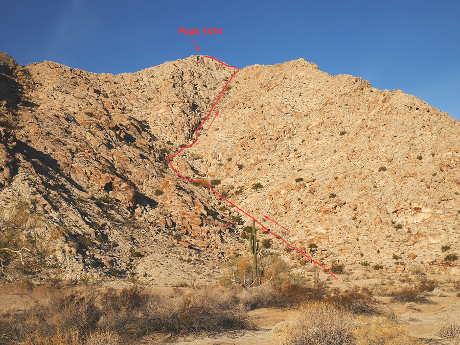 Notes on Permits for the Barry M. Goldwater Range and Cabeza Prieta Wildlife Refuge: This peak is on the Barry M. Goldwater Range, West Side. Public entry for hiking and camping is allowed with a permit from the Cabeza Prieta Wildlife Refuge office in Ajo which regulates public entry. The permit will also allow you to drive across the Barry M. Goldwater Range to reach the Refuge. For information write or call the Refuge staff at: 1611 North Second Ave., Ajo, AZ. 85321. Phone: (520) 387-6483. Four-wheel drive vehicles are required. More information on permits is at my site: Cabeza Permits Note: Before driving in call the BMGR office in Yuma at: 800-979-0657. Driving Directions: Take exit #14 on Interstate 8 which is Foothills Blvd. on the far eastern side of Yuma. Drive south to the end of the pavement which is Post "A" and the Range boundary. Be sure to have a full tank of gas and adequate water and supplies since there are no facilities in this large area. Note the following mileages starting from Post A at the boundary: At 4.1 miles reach Post A2 and go left. Hiking Directions: Go west up the canyon and follow the drainage shown in the picture above. The distance is very short, less than one-half mile, and the gain is about 530 feet. The climb takes about one-half hour to the summit. 12/14 RLC |