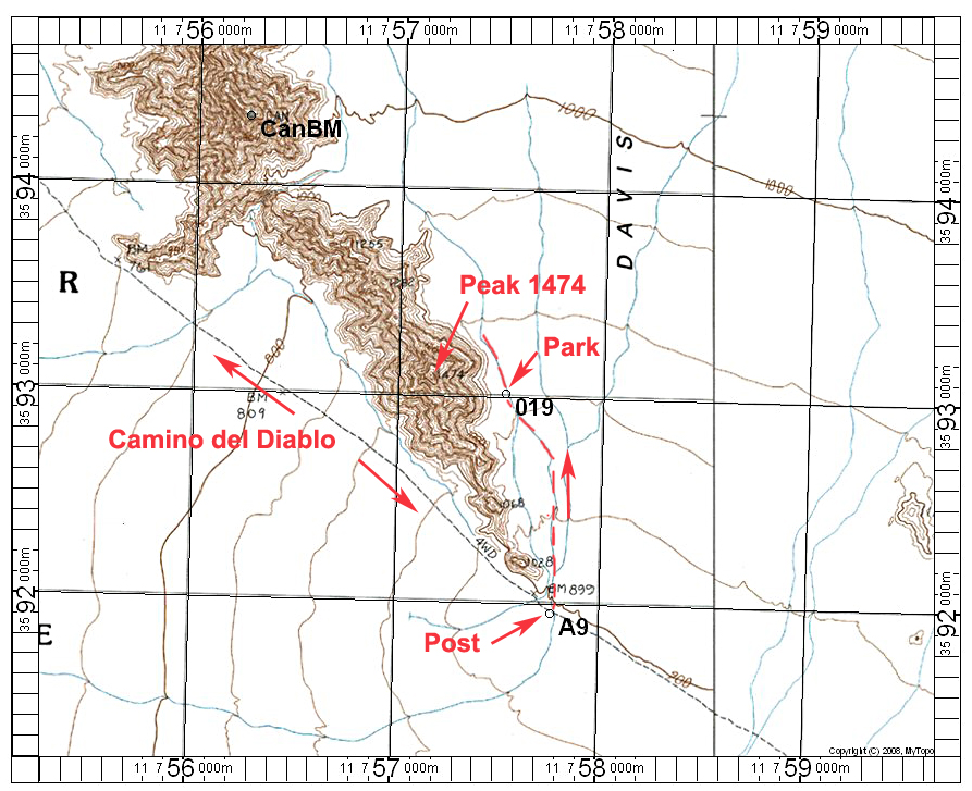 This map shows the south end of the Vokopi Ridge. Peak 1474 is the last 300 foot prominence peak on the ridge. The map has the UTM grid using NAD27 in Zone 11. A permit is needed to enter this area as explained below.