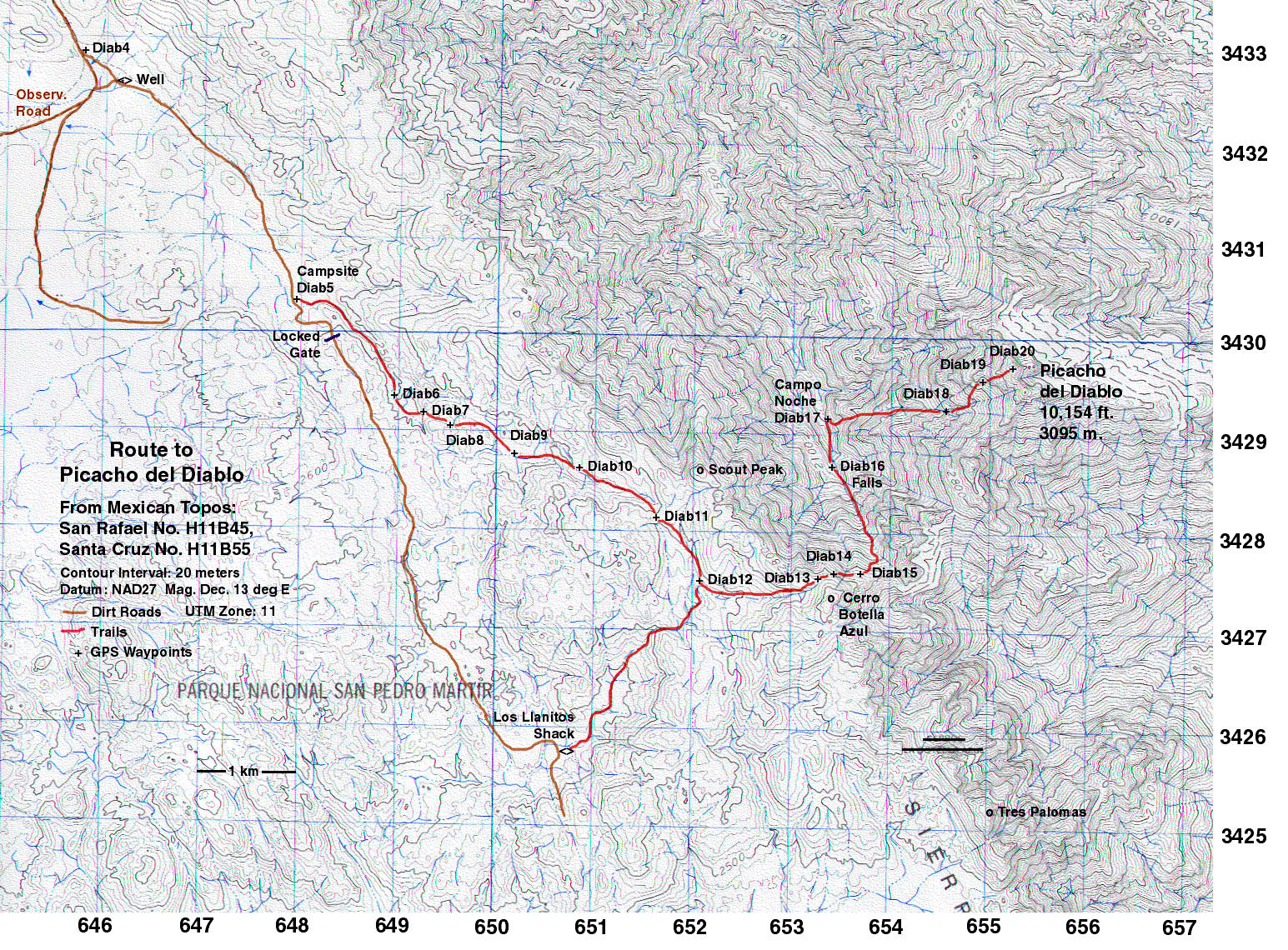 Maps: For help on the driving route the American Automobile Club map of Baja California is about the best. The hiking route is on two of the Mexican 1:50,000 scale topographic maps. The Santa Cruz map, number H11B55, has the summit and the next map north, San Rafael number H11B45, has the trailhead. Note that some named features including Picacho del Diablo and Cerro Botella de Azul (Blue Bottle Peak) are not located correctly on these maps. The map file listed here is a composite scan of both maps and has the peaks and trails correctly shown. Set your printer to landscape mode to print this map. View the map. (1.2Meg jpg file)