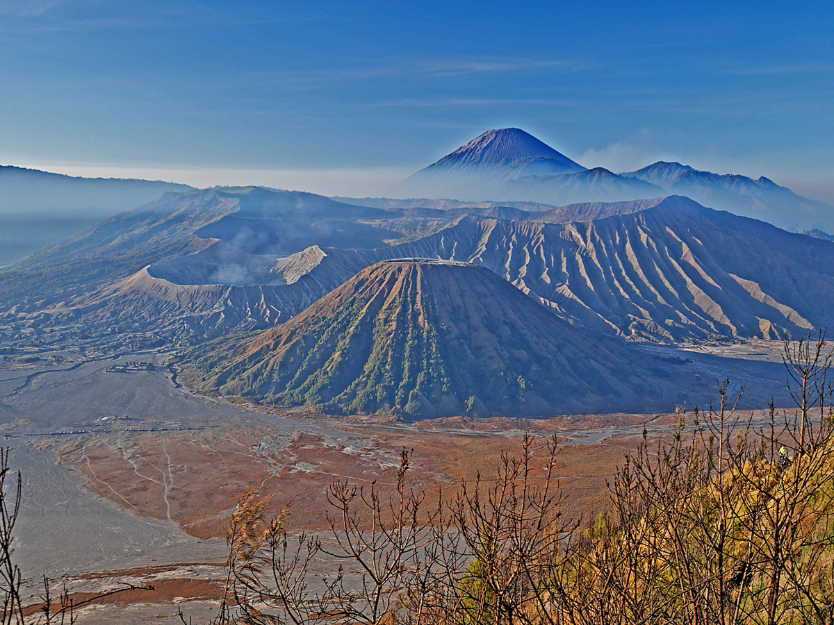 This is a view from near the top of Gunung Penanjakan on the island of Java. Mount Bromo is the smoking crater and Gunung Semeru, the highest volcano on the island is the big peak in back. |