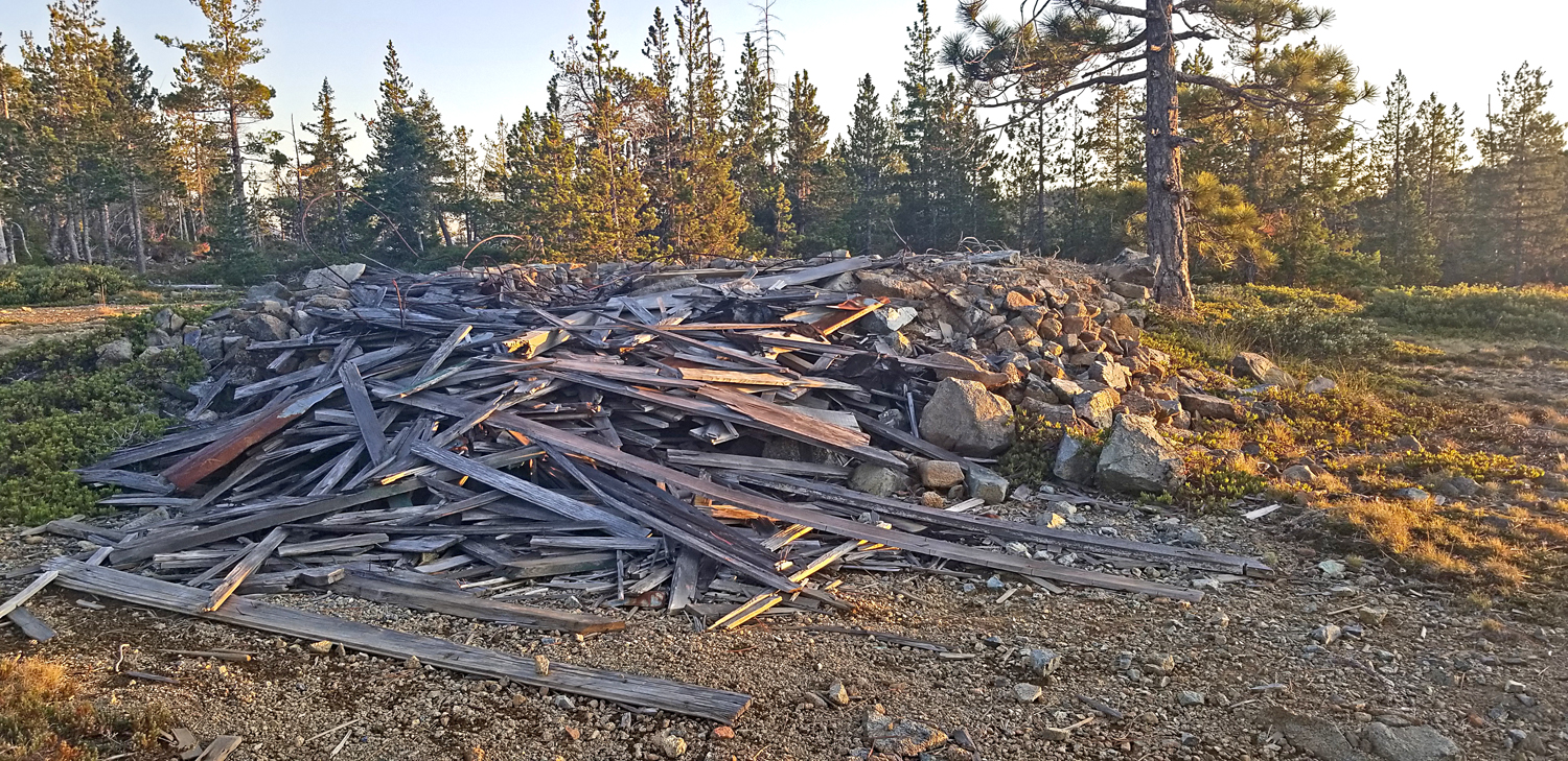 | This is all that remains of the lookout at Upper Coon Mountain. Data I have shows there was a structure built here prior to 1935. I have no information on when it was abandoned. Thanks go to Dean Gaudet for locating the site which I had placed incorrectly on a rise further south. This photo was taken by Dean on October 13, 2019. | ||||||