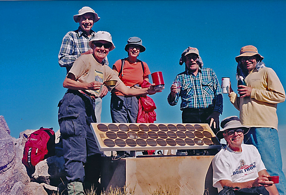 | This is our group on the summit the day after a hike of Old Woman Mountain which is not far to the northwest. From left to right Gail Hanna (in front), Rich Gnagy (in back), Kathleen Mazur, Terry Flood, Mark Adrian and John Strauch (in front). Photo by Richard Carey February 1, 2004. | ||||||