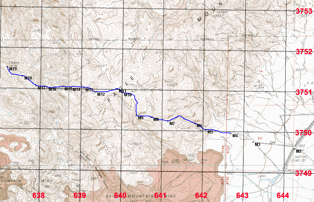 Hiking Route: Head west into the canyon which starts at point M5. The canyon is boulder-filled, but not that bad. At point M8 go left (west) at a divide and head up to a saddle with views into a large canyon (point M9). Go north here up the ridge and you should find an old miners trail which helps out. Follow this as it gains elevation and then curves west and descends to point M11. Leave the trail here and cross easy terrain with numerous small drainages to a crest at M12. Descend to the bottom of a ridge at M13. Climb the ridge to point M17 and then go west contouring around a small peak of 3360 ft. to a saddle at M18. The true summit is now in view and it is an easy walk to the top. This route is 9 miles round-trip with a gain of about 3200 feet including some of the up and downs. It took us 4 1/4 hours up and about 3 1/2 hours down. 11/13 RLC GPX file for this route. The UTM grid using NAD27 datum is shown on the above map. Higher res. map. This is a TIFF file. Print in landscape mode for best resolution. |