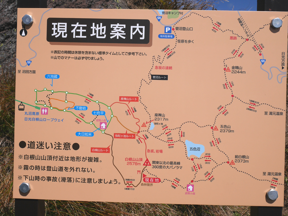 | One of several maps posted at junctions. This shows the summit and trails down the west and north sides. Yumoto Onsen is off the map on the right side. | |||||||||||||||