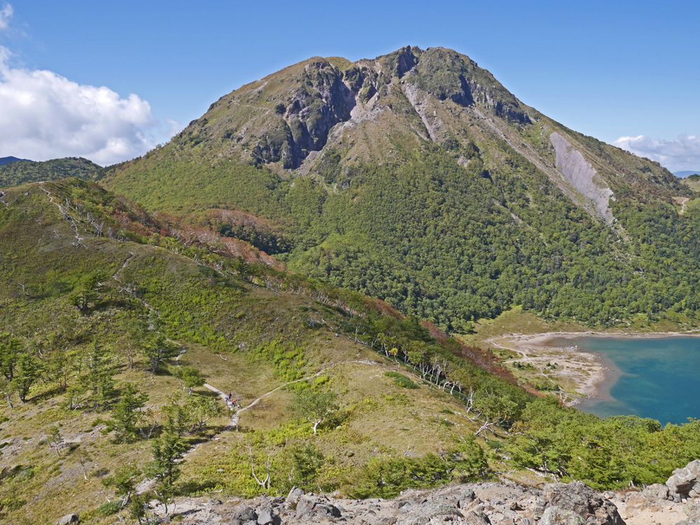 | The east side of the summit from point 75. At the junction in a minor saddle up ahead go left uphill. The lake on the right is Goshiki-numa. The hut is not visible in this view since it is over the ridge in a canyon. | |||||||||||||||