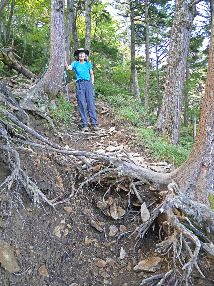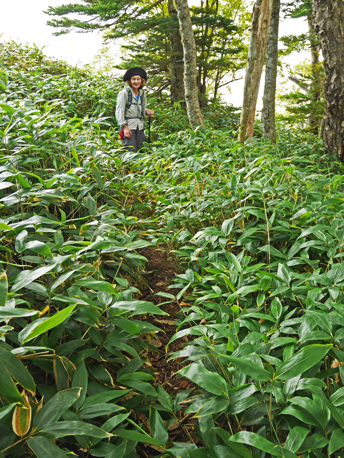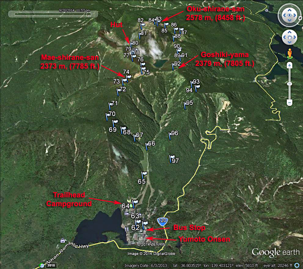 | A Google Earth image of our climbing route on the east side of the mountain starting from Yumoto Onsen. The waypoints shown are available as a .gpx file which can be loaded in your GPS receiver. Oku-shirane-san.gpx In good weather this is a wonderful scenic loop hike. The trail starts from the campground a short walk from the bus stop. After gaining elevation through an area of ski lifts the trail gets serious and ascends steeply from point 66 to a ridge line at point 70. You will be hanging onto tree roots and lims in this area. The trail is easy along the ridge and goes over a minor peak then drops down to a hut at point 79. Then it's a steep climb up to the summit. The retrun route descends the north side to a junction them east along a ridge to Goshiki-yama. From there go northeast then take a right turn at a junction and follow a lesser-used trail all the way down to the village. The route is 11.3 km (6.8 mi.) with a gain of about 1460 m (4790 ft.) to the summit. It took 4 hours to reach the summit and about 3 1/2 hours to follow the route down. | |||||||||||||||
