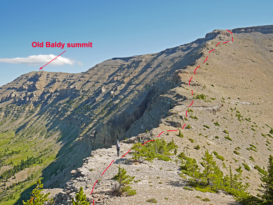 | Looking north at our route on the ridge heading to Old Baldy summit. This route is 8 miles round-trip with a gain of about 2800 ft. This is considerably shorter than the 13 mile route from the northeast that has been used by many climbers. See map with track file below. | ||||||||||