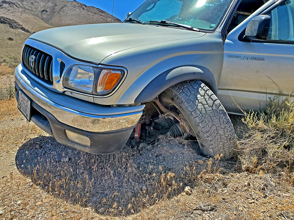 After getting gas then ice and food at the large Walmart we drove north on route 95 which leads into Idaho. We turned west onto 140 after 30 miles and continued another 35 miles to a rest area on the right which is a junction for Leonard Creek Road. We followed this road which is paved, but then turns into a good, wide gravel road after 7 miles. The road goes west then south passing by three ranches. At about 40 miles we see a dirt track on the left with a sign "Designated Route". This looks like a BLM sign. The road to the right ends at the Pahute Meadows Ranch so the dirt road offers a way around that to the Big Mountain trailhead. The road goes past Elephant Mountain, a large rounded summit on our left. It's getting late so we find a barely usable camp spot by the road and decide to try Elephant the next day. The wind was fierce with dust swirling around our trucks so I don't bother to set up the table and we each ate dinner in our camper shells. The next day is clear, calm and great for our climb of Elephant. The route goes east across open sage brush terrain and then up to a saddle and left up a steeper slope to the rounded summit. It is about 1.4 miles each way with 1300 ft. of gain. We find a register, but very few climb this remote peak. There is a good view west to Big Mountain about 18 miles distant. The hike used by most climbers is15 miles round-trip with a gain of 4200 ft. The temperature was climbing and was supposed to be in the low 90's. This is quite warm for such a long hike so we decide to skip Big Mountain and leave the area. On the drive out on the dirt track I take a dip too fast and the truck lurches left, drops down, and comes to an abupt stop. On no!! I had an idea that it was a serious problem and when I got out I saw the left front tire bent at a weird angle and dug into the sand. The left side suspension had collapsed. This happened to me a couple years ago on the right side in eastern Arizona. I radioed Shelley that there was a big problem and I was not going anywhere. Fortunately, we travel in two vehicles so she would be able to take us out to the paved highway. We were 45 miles from a paved highway with no cell service. |