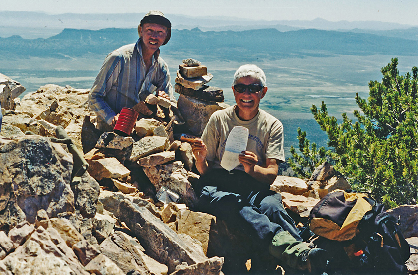| Richard Carey and Gail Hanna signing the register at the cairn on the ridge that is on the Lincoln and White Pine county lines. Photo taken in July 4, 2003. | ||||||||