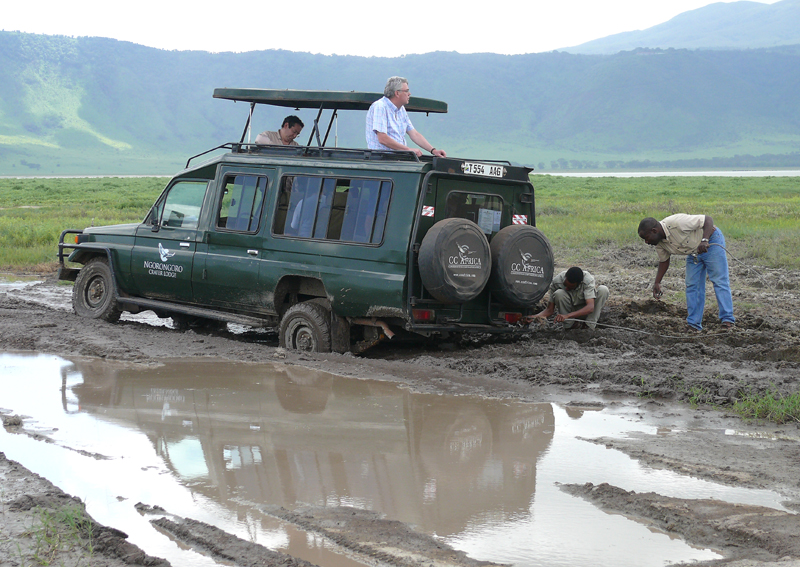 Stuck in bottom of Ngorongoro Crater. This could happen to you! We helped to pull them out of the mud.
