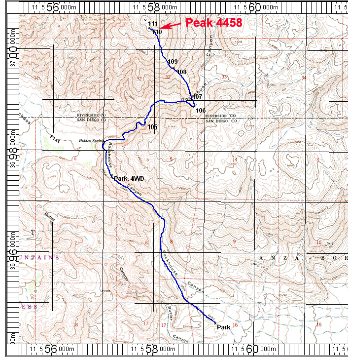 Driving Directions: From the Christmas Circle in Borrego Springs drive east on Borrego Springs Road which is route S22. The highway passes the airport then goes north past Pegleg Historical Marker and then east toward the Salton Sea. At 1/2 mile east of Pegleg turn left (north) on signed Rockhouse Trail which is paved for a very short distance then turns into graded dirt. The road has a lot of washboard surface, but otherwise is good for most any high-clearance vehicle. A short section crosses the Clark Dry Lake and it is best not to drive this if there has been recent rain. At about 8.8 miles there is a junction and sign for Butler Canyon. Go right here. We stopped at the PARK location where the road dipped into a wash with many big boulders. A 4WD vehicle with high clearance is needed beyond this point. More adventurous drivers can drive another 2.9 miles to the PARK, 4WD location which is the wilderness boundary. There is plenty of turnaround space and room to camp there. Hiking Directions: If you stopped at the 2WD PARK location you will have a 2.9 mile walk on a sandy road to the 4WD trailhead. From there head northeast into Rockhouse Canyon. The walking is easy until point 105 where a 20 foot dry waterfall is located. It is a scramble on the right side to get past this obstacle to where the wash is easy once again. At point 106 there is a sharp bend and we headed north up the slopes. The ridge is good except for some steep, rocky terrain between points 108 to 109. It is a 2100 foot climb from point 106 to the summit which takes about two hours. There is a register and Terra Cache at the summit. The northern rounded summit (point 111) is about 580 feet away and is nearly the same height. Our simple hand level was not conclusive. Peak4458 GPX file Stats: From the 2WD PARK location the hike is 13.8 miles round-trip with a gain of 3200 feet. Allow about 4 1/2 hours up and 4 hours down. If you can get to the 4WD trailhead that will cut off 600 feet of gain and 5.8 miles. The drive in is slow and takes up to an hour from S22 to the 4WD trailhead. In the winter months get an early start. 1/14 RLC |