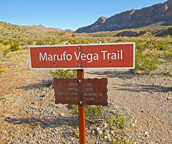 The above map shows a hiking route to the summit of Peak 3540 ft. which is about the highest peak in this remote area of Big Bend Park. The route makes good use of the Marufo Vega Trail which is well marked and easy to follow. The sign below is at the trailhead at point T1. You can get to this point by driving east on the paved road to Boquillas Canyon Overlook. The turn is 1.2 miles north of the Rio Grande Campground. Follow the road for 3.0 miles to the trailhead which is a very short distance past the spur road to the overlook. Hike north on the trail which is in a broad wash to point T3 with a junction. Go right here. The trail climbs up to a junction at T5 where you go right up a steep, stone-filled section to higher ground. The trail wanders across open country with another junction near T9. Go right heading into a canyon. At T14 go right on the South Fork Trail. At T15 you get a good view of the peak. Leave the trail and head toward the slot at T19. Once through the slot head right toward the summit. This route is about 10.2 miles round-trip with a grain of about 2200 feet counting some of the drops along the way. Be sure to have plenty of water. The above map has the UTM grid using NAD27 in Zone 13. 3/15 RLC A GPS file is available for this route: Peak3540.gpx | ||||||||||||