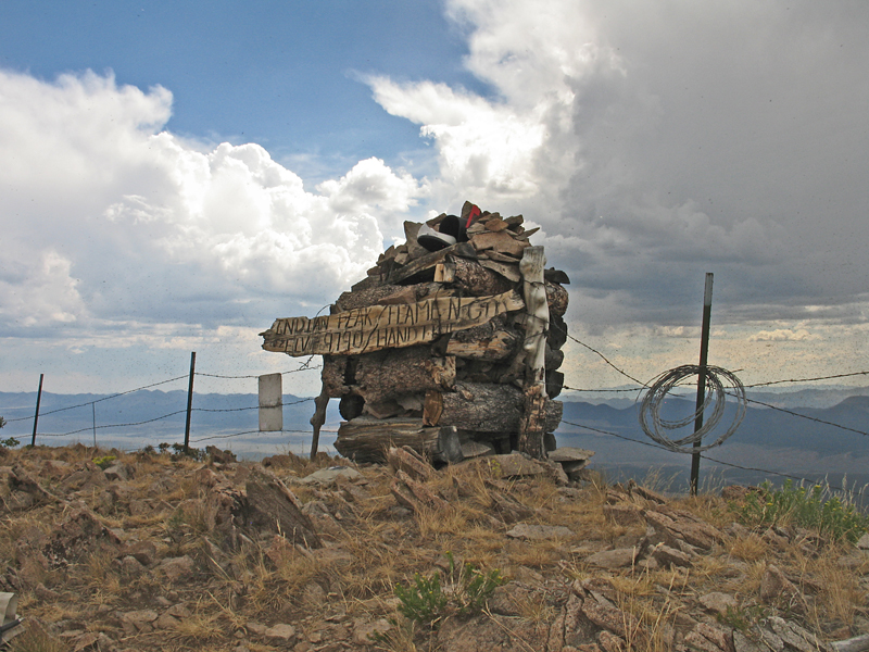 | The summit cairn on Indian Peak. When we visited there was a huge swarm of fying ants around the cairn. Getting to the register in the mailbox was nasty! | ||||||||||