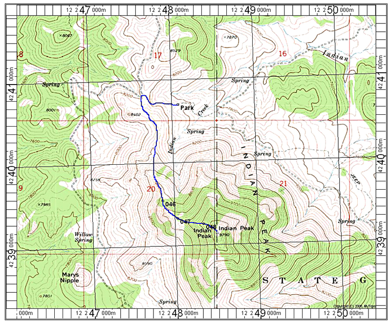 | A topo map showing our route on the north side. There is a good report on the drive-in to this peak by Dean Molen on SummitPost. There is a north-south fence on the boundary line that runs right through the summit. At the boundary where the road loops back south there is a cattle guard. The Jeep road going west from there is rough with deep ruts. We went about 0.3 miles further and parked at about 8100 feet as shown. We walked the road to a crest and headed south on a track then up to the ridge (point 046). There is some sidehilling on talus, but otherwise the route is good. The distance is about 3.8 miles round-trip with a gain of about 2000 feet due to some dips. It took us 1 1/2 hours to reach the top. The above map has the UTM grid using NAD27 datum, zone 12. 7/2013 RLC | ||||||||||